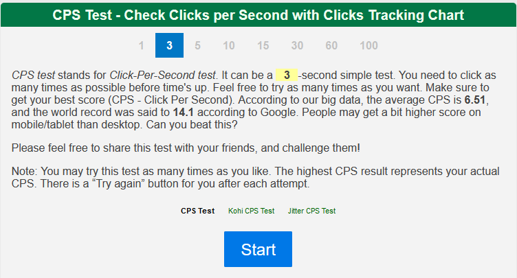 I think a cps limit will be very useful because there is atleast one autoclicker in every game. Cps test provides the exclusive clicking test for minecraft users. Players can determine the speed at which they can check several mouse clicks they can hit in a given time frame. The cpstest is more likely a timepass game there you can set the highest. Please feel free to share this test with your friends, and challenge them!